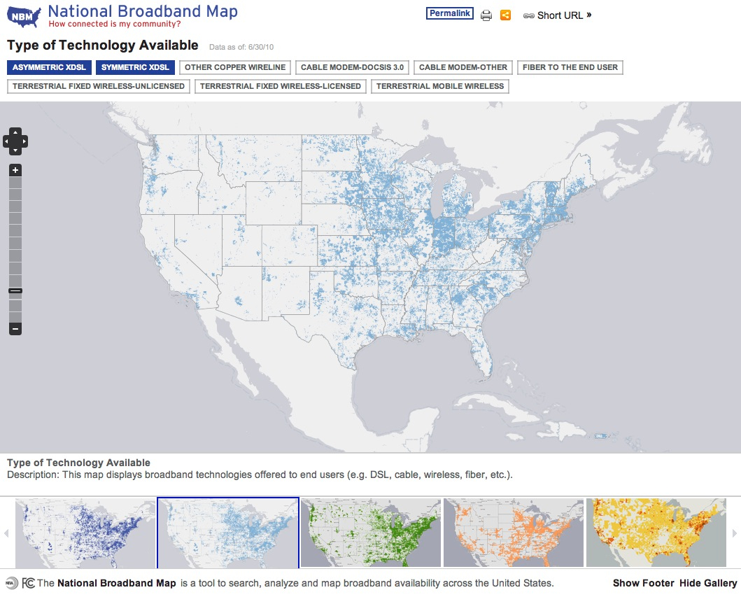 Now you can use a free National Broadband map online. The government site, updated twice a year, will show you what types of broadband are available in all of the 50 U.S. states (Cable, DSL, Mobile, etc.), what companies provide service, and maximum advertised speeds.